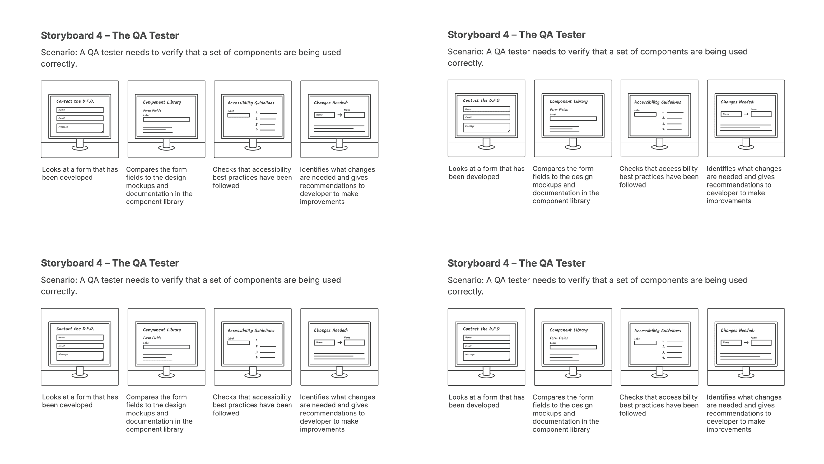 Storyboards were made to reflect each of our four original personas: The UX Designer, The Developer, The Graphic Designer, and The QA Tester.