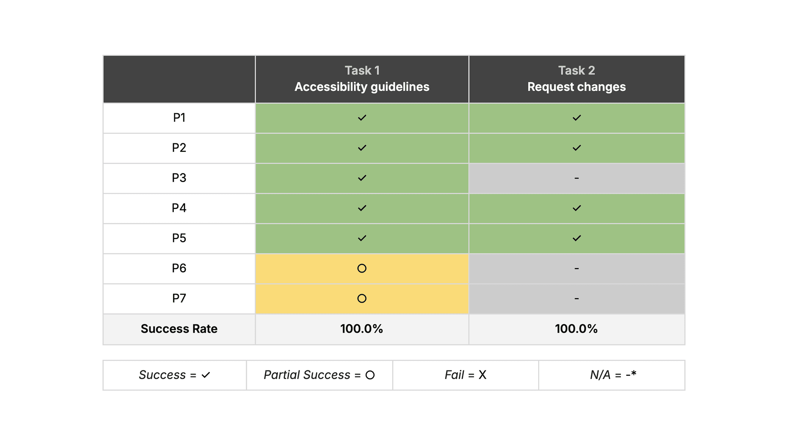 Most tasks were successful, particularly those involving the Request Changes, Directory, Branding Guidelines, and Component Library pages, which participants navigated quickly. Challenges in reaching the Best Practices and Accessibility pages resulted in a 14% partial success rate. The general Best Practices page task had the lowest success rate, contributing to the 14% overall task failure rate, and was later revised in our next iteration.