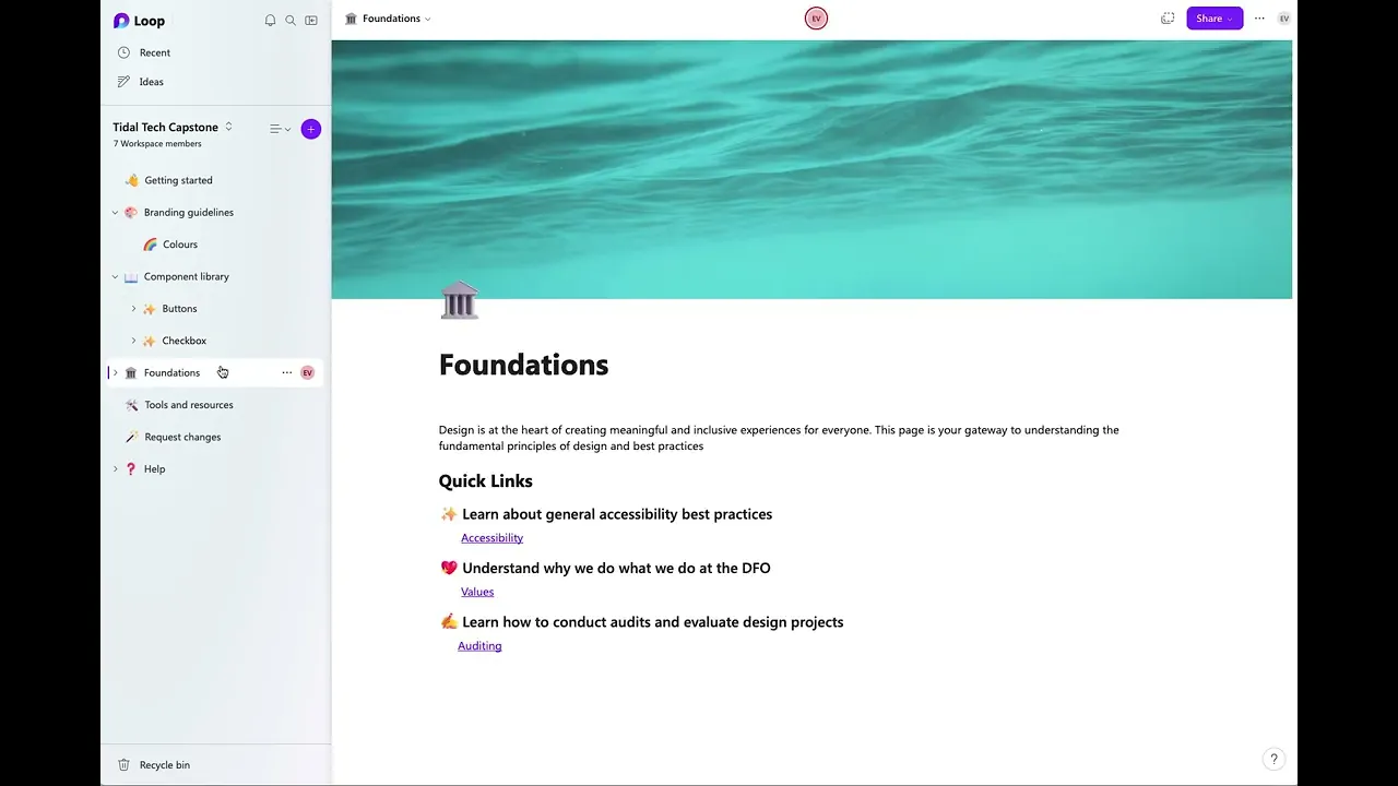 After developing our prototype in Figma, we transitioned to building select pages using Microsoft Loop. This choice was strategic, as Microsoft Loop is a tool that the DFO already uses and has already gone through the necessary security and privacy processes. The tool also offers the necessary functionality for a live prototype. We created several functional pages in Microsoft Loop to demonstrate the resource repository's potential; however, these pages were not fully populated with content.